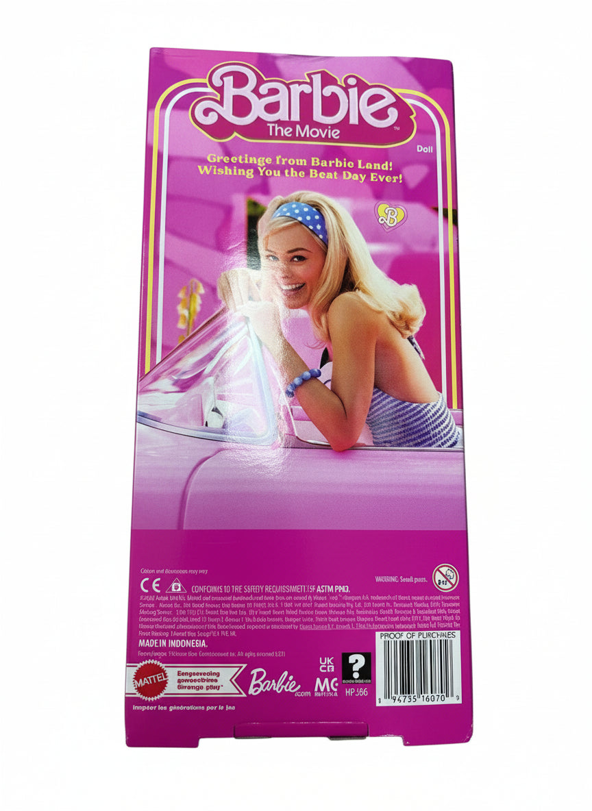 Greetings from Barbie Land! This Barbie doll cuts a timeless silhouette in a sweet dress modeled after one of her character's iconic looks in Barbie The Movie. With her pink gingham dress, daisy necklace and pastel pumps, she's ready to have the best day ever in Barbie Land! In the likeness of Margot Robbie as Barbie, this doll makes a great gift for fans and collectors alike. Doll cannot stand alone. Colors and decorations may vary.